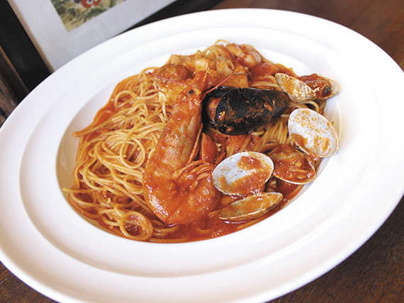 - 大きなエビや殻付きのムール貝が盛り付けられた味も見た目も大満足の同パスタは、創業当時から人気No.1メニュー!5種類の海の幸をふんだんに使用し魚介の旨味が溶け込んだソースは、トマトの酸味が効いたさっぱりとしながらもコクのある味わい。アルデンテ食感の細麺とソースが良く絡み最後の一口まで美味しいボリューム満点の一品をぜひ楽しんでいただきたい♪