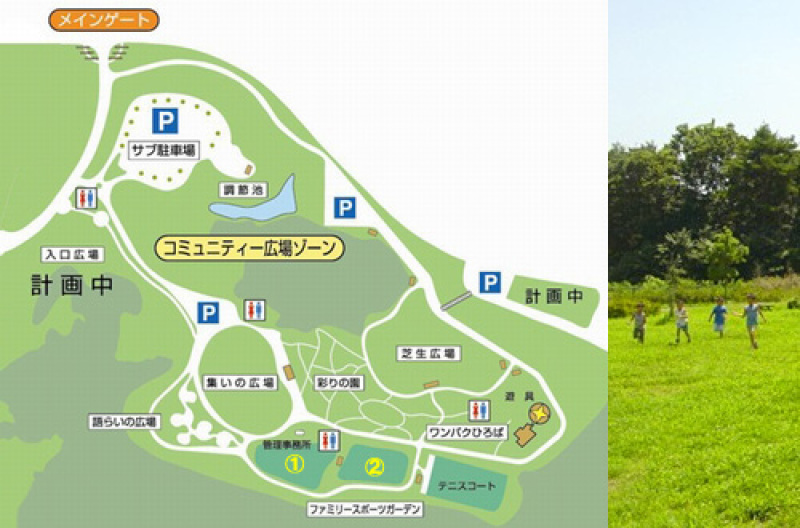 21世紀の森公園正面入口(メインゲート)から入ってすぐ左側がコミュニティ広場となります。多目的フィールド(テニスコート)は、その南西部に設置されています。